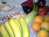 Käymme ulkona syömässä pari kertaa viikossa. Täällä on myös edullista kokata itse. Lähes päivittäin teemme lounaaksi horiatiki-salaattia. Se ainekset ovat täällä halpoja (meille osin ilmaisia: naapuri toimittaa tomaattia yllin kyllin) ja jumalaisen hyviä! Suomessa lopetimme keväällä tomaattien ostamisen kokonaan, koska ne maistuivat jollekin aivan muulle kuin tomaatille. Täällä ei tarvitse miettiä, onko punainen väri peräisin vain kohdevaloista marketin hevi-osastolla.