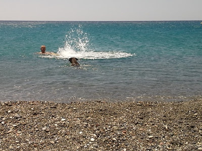 Mukava tapa lenkittää koiruudet on kävellä tai pyöräillä alas merenrantaan. Käymme lähes päivittäin parin – kolmen tunnin uimareissulla. Se sisältää puolisen kilometriä pitkän, rennon laskeutumisen alas rinteen serpentiiniä, sitten parisataa metriä hiekkatietä läpi oliivitarhan, jossa kaskaat sirittävät korvia huumaavasti, ja sitten on vielä viisikymmenmetrisen biitsin ylitys ennen merta.
