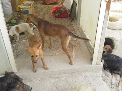 Koiria on kirjaimellisesti ihan kaikenkokoisia ja –näköisiä: pienistä parikiloisista pari- kolmikymmenkiloisiin. Juuri yhtään rotukoiraa ei joukosta erotu, paitsi ehkä yksi aika puhtaan näköinen pitbullin pentu, nippa nappa luovutusikäinen pikkukaveri. Se on jätetty eläinlääkärin lopetettavaksi, koska on pitbull, meille kerrotaan.
