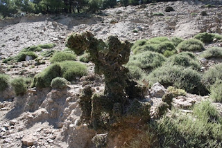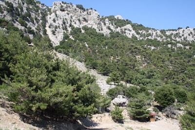 Erinomaisen hyväkuntoinen, uusi asfalttitie polveili Dikti-vuoristoon kohti temppelinraunioita. Pyörän bensamittarin tankkausvalo oli syttynyt, mutta kunhan ylös päästäisiin, alas tultaisiin helposti ilman bensaa. Maisemat olivat tyypillisiä ylämaille: käkkyräisiä pinja-mäntyjä, vuohien syömiä pensaita, kukkivia timjamipuskia kuin violetteja tyynyjä, mehiläispönttöjen rivistöjä.