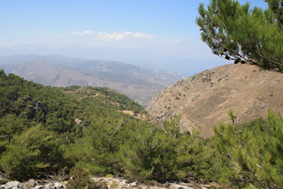 Pinjat ovat paikoitellen kuin bonsai-puita, niin vänkkyräisiä niiden rungot ovat. Vuohet ovat tehneet omia taideteoksiaan tien varrelle pureksimalla puista ja pensaista kaikki ne osat, joihin ovat yltäneet. Kellojen kalkatus on tauotonta, vaikka emme näe yhtään elikkoa. Mehiläispesiä on tuotu keräämään mettä kanervasta ja timjamista.