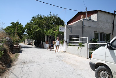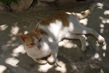 Toisen välipalapaikan löysimme kylän siitä mutkasta, jossa ovat pysäköintikieltomerkit. Hyvällä ja edullisella horiatiki-salaatilla virkistäytyneenä jatkoimme kyläkierrosta. Kyseisessä Traditional Kafeniossa tuli nähtyä sellainenkin tapaus, että kissa otti kaskaan kiinni puun rungolta ja pisteli sen hyvällä halulla poskeensa.
