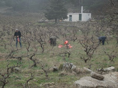 Pilvet vörrivät laaksoista yli huippujen tai sitten toisin päin, kurottelevat yli huippujen; mistä milloinkin tuuli käy. Ystävien viinitarhalla puuhailtiin päivä ihan pilvessä. Valkea usva tuprusi kuin savukoneesta vuoren laella olevan notkelman ylitse. Isoisän mökin raunioilla kukki mantelipuu ja rouvat keräsivät villivihanneksia, hortaa. Isännät leikkasivat viiniköynnöksiä.
