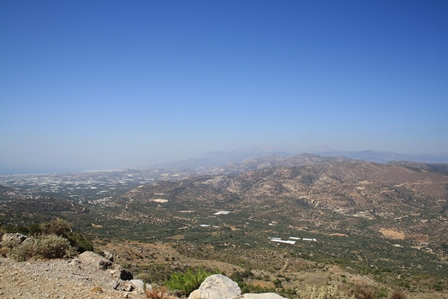 Alhaalla laaksossa erottuvat selkeästi Vassilikin minolaisen kylän rauniot ja Vassilikin kylän hulppean suuri kirkko. Niiden takana häipyvät hiekkatiet näkymättömiin yli matalampien kukkuloiden, ohi Agios Nikolaoksen ja kohti Lassithin tasankoa. Ierapetran länsipuolella rannikko on kuin katettu muovilla, niin täynnä kasvihuoneita alue on. Oliivitarhat ruuduttavat ja raidoittavat laaksoa ja sen kukkuloita, joiden rinteet on porrastettu puiden kasvatusta varten.