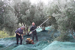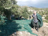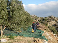 Loput oliivit päästiin keräämään hyvässä talvisäässä eli auringonpaisteessa. Oliivit säkitetään oikeastaan kahteen kertaan, sillä ensin ne kerätään säkkeihin puiden alta, sitten kaadetaan suureen siivilään. Toiseen säkitykseen saadaan melko puhdasta ”marjaa”. Lehvät kerätään vuohien herkuksi. Lissut olivat tällä kertaa koolla kaksin kappalein. Ravistelivat ”konetta” ja puhua kalkattivat.