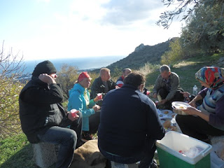 Kun aurinko palasi taivaalle, se nosti lämpötilat jälleen kahdenkympin tuntumaan. Pääsimme toisellekin oliivitarhalle, tällä kertaa laaksoon. Kaukana, vuorten huipuilla hohtelivat vasta sataneet lumet, mutta jokilaaksossa oli lämmintä, vuokot kukkivat ja mustarastaat ja talitintit lauloivat. Lampaankellojen puliseva kalkatus ja tuulen suhina oliivien latvoissa tulevat varmaan aina olemaan ääniä, jotka palauttavat mieleen juuri nämä päivät.