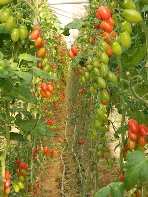 Vieraillessamme viljelmällä oli tomaatin kasvatuksen vuoro, ja kesäisen lämpöinen kasvihuone kuin karkkikauppa: siisteissä riveissä roikkui eri kypsyysasteissa koreilevia tomaatteja vihreistä oransseihin ja kypsän punaisiin. Kimalaiset pöristelivät keltaisten kukkien lomassa hoitamassa tärkeää tehtäväänsä. Niiden ”taloja” oli siellä täällä rivien väleissä. Kelpasi siinä pohjoisen immeisten ihmetellä, että tämmöinen on etelän joulukuu.