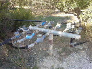 Siellä täällä tienvarsissa näkee ihmeellisiä vesijohtohäkkyröitä, kun pääjohto haarautuu kunkin tarhurin omiksi putkistoiksi. Joka haarassa raksuttaa oma mittari. Näitä hanoja käydään kääntelemässä auki ja kiinni ihan käsipelillä. Oliivinkasvattajat ajelevat pitkiä matkoja, huonoja teitä, läpi vuoden näissä puuhissa. Ilmaiseksi ja helpolla öljy ei tule, vaikka tulisi omista oliiveista.