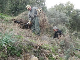 Jykä, Jorgos ja pojat puuhastelivat muutaman päivän raivaamassa oliivitarhaa. Yllättävän paljon työtä tarhojen hoitaminen teettää. Usein puut kasvavat vaikeissa paikoissa vuorten rinteillä. Terasseja pitää tukea kiveämällä, risuja raivata, kasteluputkistoa kunnostaa.