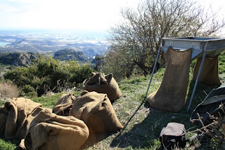 Sitä mukaa kun puut on päristetty tyhjiksi, verkkojen helmoja nostelemalla ajetaan oliivit kasaan, säkitettäväksi. Verkot kiikutetaan seuraavien puiden alle ja prosessi toistuu. Pääosin aloittelijoista koostuvalla porukallamme homman tahti pysyi sopivana, lämmin tuli mutta kunto kesti. Silti ruokatauko oli tervetullut.