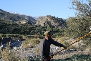 Sattui sitten niin mukavasti, että Ierapetran vakituisempi Lissu, Liisa Sirkiä, kutsui meidät keruutalkoisiin. Puoliso Jorgoksella on oliivitarha komeissa maisemissa Ierapetran yläpuolisilla rinteillä. Varustauduimme eväillä ja kunnon kerrospukeutumisella ja joulukuisena aamuna kello puoli kahdeksalta liityimme työmatkalaisten joukkoon jännittyneinä mutta kovasti innostuneina.