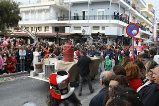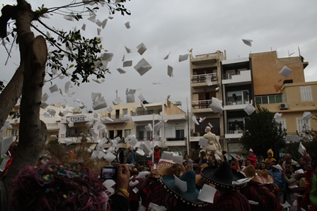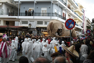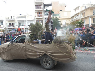 Paaston alkamista edeltävät karnevaalit. Ierapetran juhlat ovat pienet ja hellyttävän kotikutoiset Rethymnonin juhlahumuun verrattuna, tiesi meitä valistaa kyseisestä kaupungista muuttanut Liisa-kaima. Periaate on kuitenkin sama: yhteisö ilmoittautuu karnevaaleihin ja kokoaa joukkueelle samanhenkisen asun valitun teeman mukaan. Rekvisiittaan kuuluu myös kulkueauto, joka tuunataan kokonaisuuteen sopivaksi.