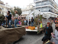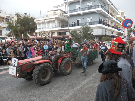 Paras karnevaalitoteutus oli ehdottomasti viljelijöillä. Kulkueessa oli useita autoja. Yhden lavalla oli kasvihuone tomaatteineen ja niiden parissa työntekijöitä. Ympärillä hääri reppuruiskuineen tuholaistorjujia, jotka ammuskelivat pääasiassa yleisöä ruiskuillaan. Tuoksu oli onneksi ja toivottavasti jotakin parfyymia. Erään auton lavalla mehiläistarhurit savuttivat mehiläispesiä. Ja hyvin luontevasti yksi autoista kuljetti grilliä, josta ”esiintyjät” napostelivat possuvartaita ja annostelivat peräkärryn pannusta muovimukeihin polttotuoretta rakia! Esillä oli siis koko maalaiselämäntapa, jonka sydämenä Ierapetra sykkii.